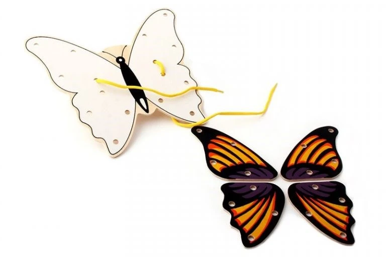 Играя таким образом, ваш ребенок развивает мелкую пальцевую моторику, точность и скоординированность движений. Дополните игру познавательным элементом — научите ребенка определять правое и левое крыло, нижнее и верхнее, научите считать отверстия. А в завершение позвольте малышу пофантазировать: помогите ему обрисовать трафарет бабочки и предложите разукрасить контур, придумать сказку о своей бабочке.