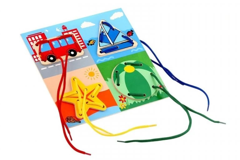 В процессе игры обсудите с ребенком, почему звездочка, парусник, арбуз или автобус пришнурованы именно на это место, что произойдет, если их поменять местами (машина не может быть в воде, а кораблик в траве), а какие картинки могут поменять свое место (мячик может быть в воде, в песке, на дороге). Ну и конечно же каждая картинка может рассказать свою историю.