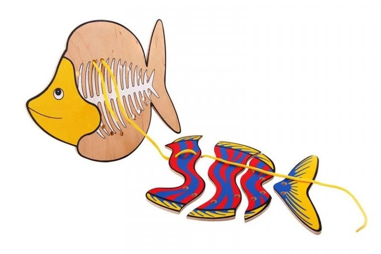 Шнуровка «Рыба» состоит из основы рыбки, четырех накладных частей рыбы и шнурка. Пришнуровывая детали рыбки к основе, называйте их малышу: голова, плавник, хвост. Расскажите, где живет рыбка, чем питается. Предложите малышу обвести рыбку-основу и разукрасить ее по-своему. Со временем у вас может появиться самый настоящий аквариум с фантастическими рыбками.