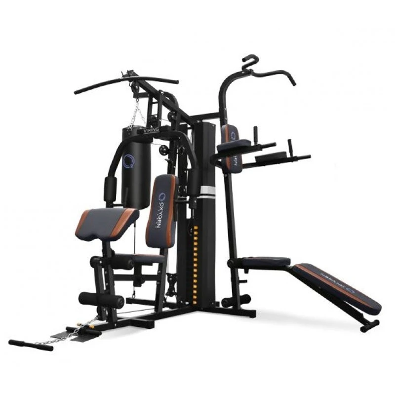 Трехпозиционный многофункциональный силовой комплекс – это идеальное дополнение для занятий ЛФК. Первая, она же центральная станция позволяет выполнить массу различных упражнений – жим от груди, баттерфляй, верхняя и нижняя тяги, гребная тяга, упражнения на бицепс (с использованием парты), упражнения на трицепс (с использованием верхней тяги с наращенной цепью), упражнения на пресс и спину (с использованием накладки на спину), а также отведение и приведение ног (с использованием входящего в комплект держателя для голени). Вторая станция является классическим вариантом "турник-пресс-брусья", для обучающихся невысокого роста предусмотрена небольшая ступенька. Наконец, третья станция – это опять же классический вариант боксерского мешка.