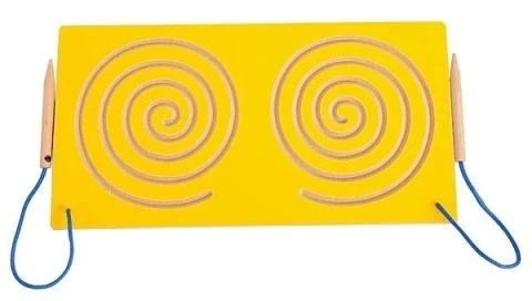 - Лабиринт представляет собой фанерную доску, в которой выполнены два паза (лабиринты) в форме улитки, по которым имеется возможность одновременно провести деревянными ручками (левой и правой руками)