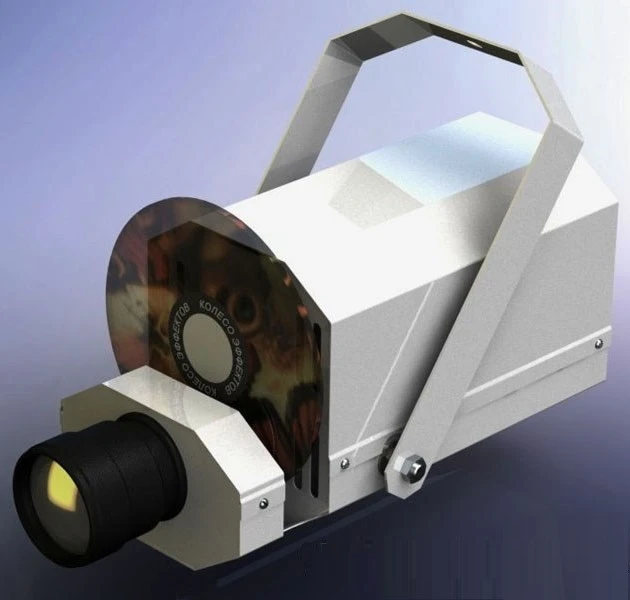 Проектор визуальных эффектов. Источник света – сверхъяркий светодиод со светоотдачей, достаточной для проецирования слайдов и вращающихся колес. Использование сверхъяркого светодиода позволяет экономить электроэнергию без потери светоотдачи прибора. Световой поток формируется трёхлинзовым конденсором и после прохождения через колесо-слайд* попадает на объектив, который формирует изображение. Прибор оснащен ротатором, вращающим колесо смены цвета.