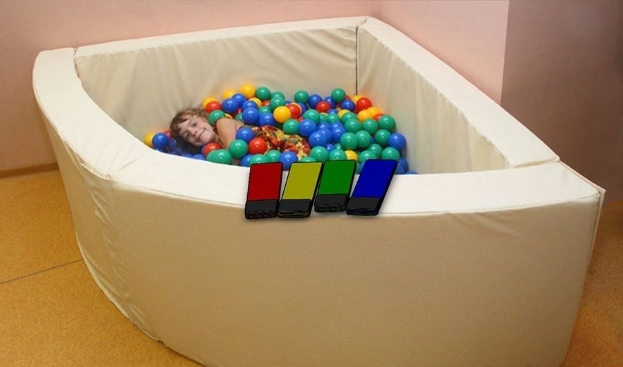 Каркас состоит из мягких стенок-матов с добавлением высококачественной фанеры. Материал: ПВХ, наполнение: поролон. Для выбора цвета подсветки сухого бассейна используются клавиши-переключатели черырех цветов, которые на проводах могут быть как вынесены на стенки бассейна, так и установлены за его пределами на полу. В состав также входит система подсветки, которая содержит электронное устройство управления, позволяющее автоматически переключать цвета подсветки без клавиш.