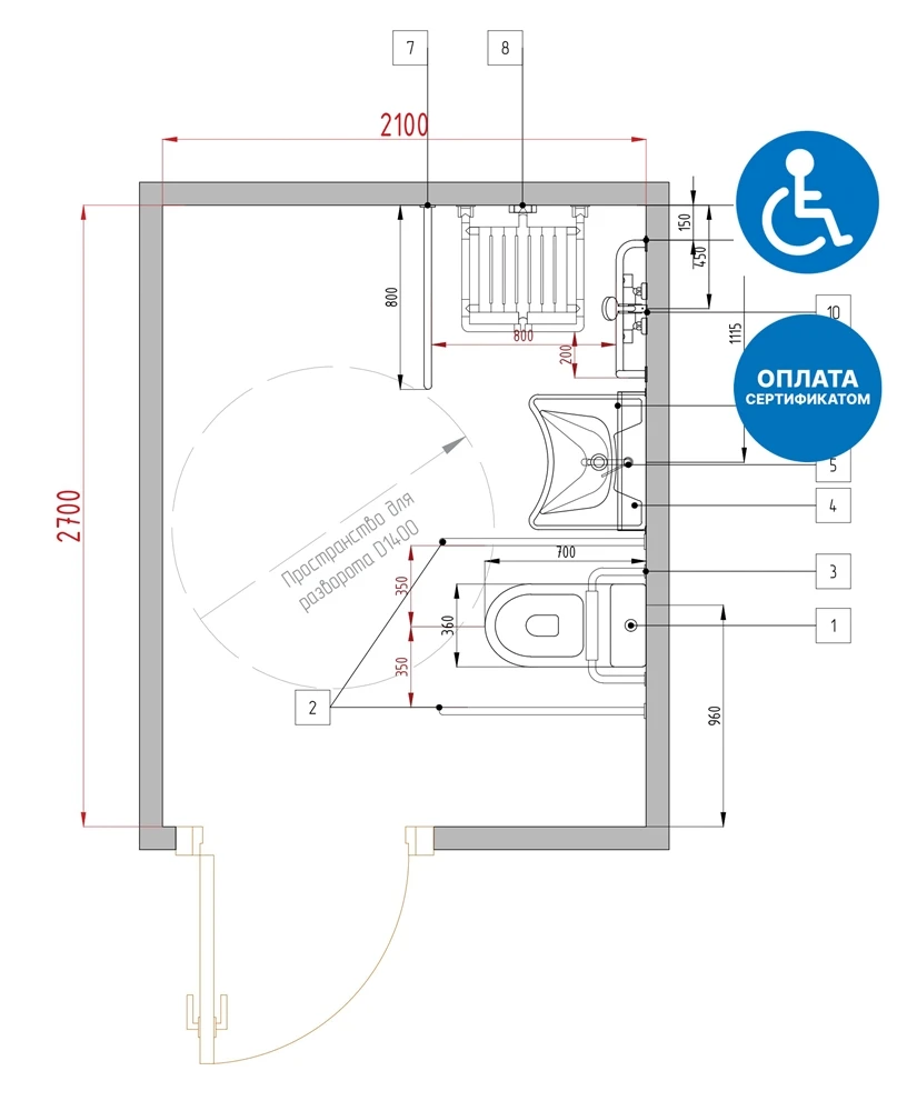 Оборудование подобрано в соответствии с нормами по доступной среде и с фокусом на эргономику движений человека на коляске в ограниченном пространстве квартирного санузла.