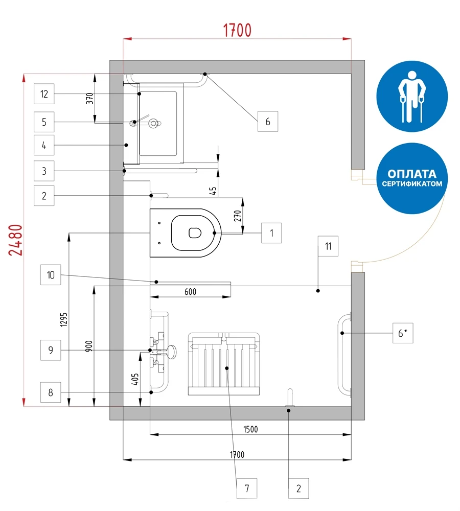 Оборудование подобрано в соответствии с нормами по доступной среде и с фокусом на эргономику движений человека на коляске в ограниченном пространстве квартирного санузла.