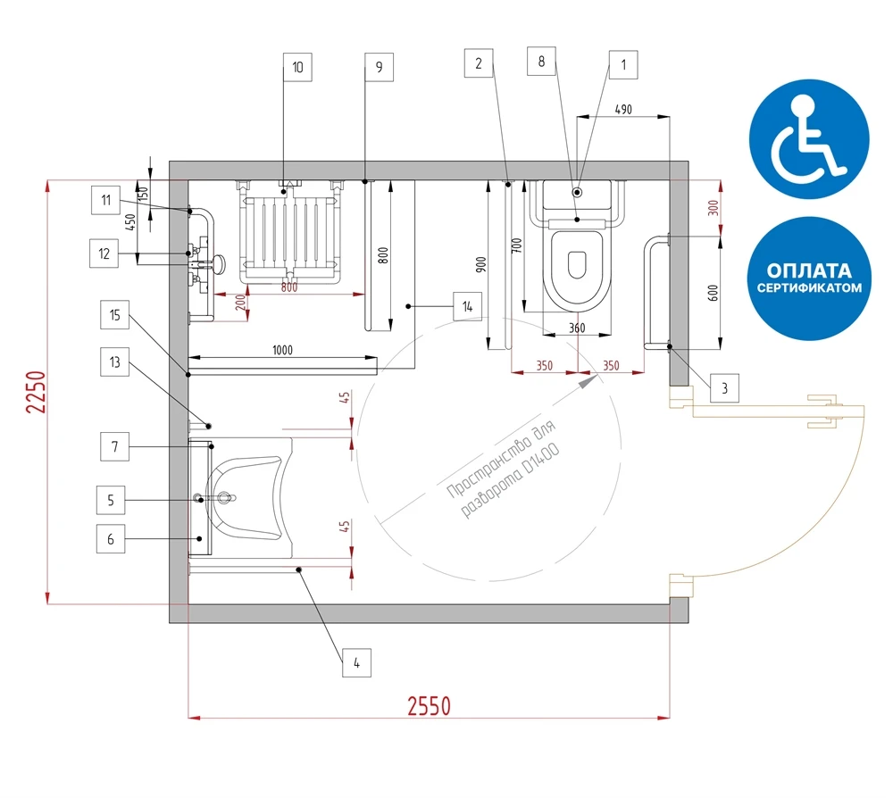 Оборудование подобрано в соответствии с нормами по доступной среде и с фокусом на эргономику движений человека на коляске в ограниченном пространстве квартирного санузла.
