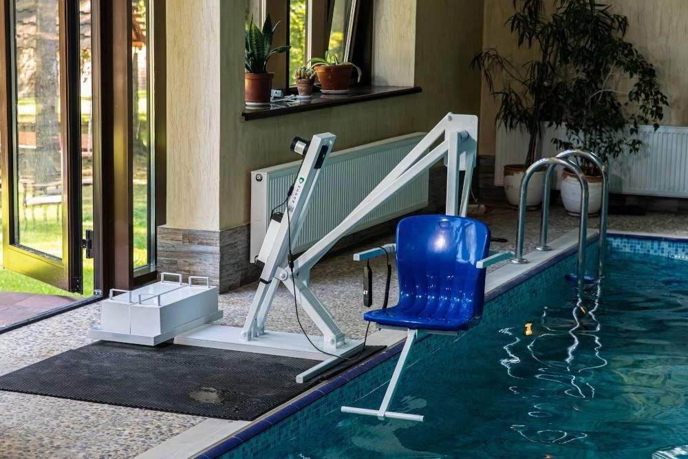 Стационарный, электрический подъемник для бассейна. Благодаря тяжелым противовесам подъёмник не требует монтажа и нарушения системы теплых полов. Его достаточно просто установить, а при необходимости можно легко переместить, не нарушая целостность напольного покрытия.