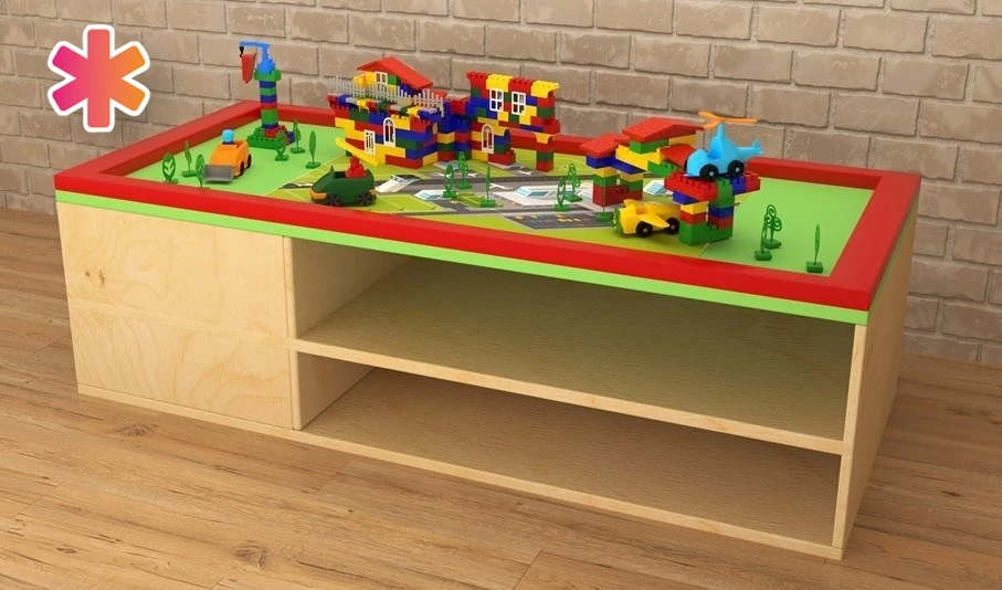 STEAM-стол “Пчёлки на полянке” – многофункциональный развивающий детский игровой модуль. Главное его преимущество – рациональное использование имеющихся площадей – на столешнице расположена ландшафтная локация полянки с пчёлками, а на боках стола – развивающие элементы и полки для хранения игровых наборов; всё это делает его необходимым элементом оснащения пространства для занятий с детьми. Ландшафтные столы широко используются дошкольными педагогами и некоторыми узкими детскими специалистами.