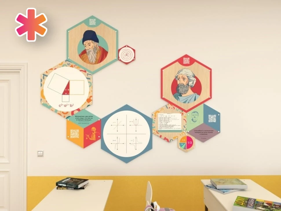 Каждый шестигранник содержит обучающую информацию: портреты выдающихся людей, их достижения и великие цитаты, основные постулаты науки, формулы, графики, теоремы. Благодаря qr-кодам дети могут подробнее узнать об учёных, изображённых на портретах, стоит только навести на них телефон.