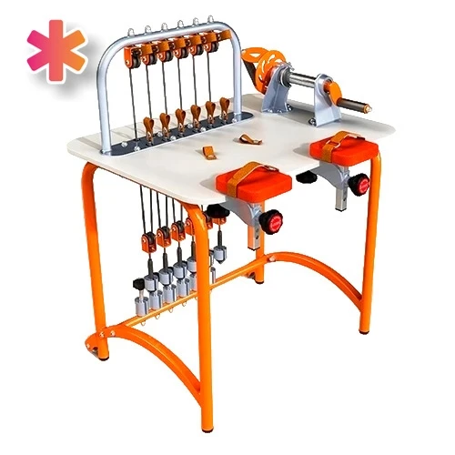 Рабочая станция для ЛФК и эрготерапии с закреплёнными модулями для тренировки сгибания/разгибания пальцев, оппозиции большого пальца, щипкового, крючкового и цилиндрического хватов, пронации/супинации предплечья, а также упражнений на силу, координацию и мелкую моторику. Конструкция объединяет в одном месте широкий спектр упражнений с точной дозировкой нагрузки, контролем амплитуды и быстрым переключением между задачами.