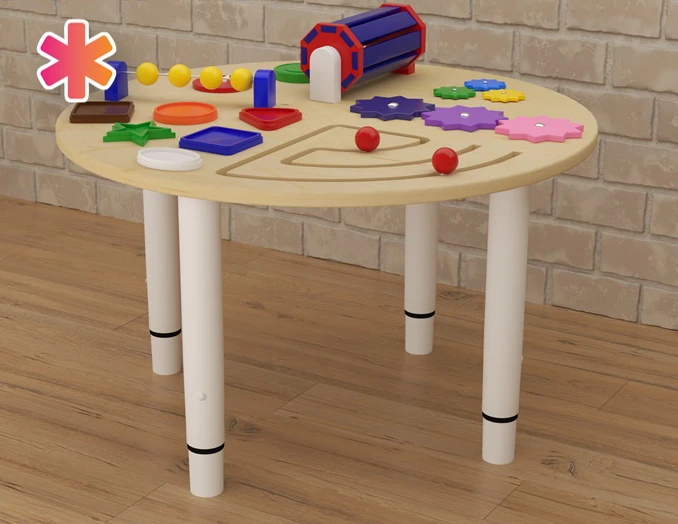 Детский игровой стол с элементами бизиборда очень удобен для развивающих занятий с детьми. Малышу необходимо крутить шестерёнки в разном направлении, чтобы понять на наглядном примере, как воздействие на один элемент влияет на остальные связанные. Ребёнок может перемещать элементы по тактильному лабиринту по очереди или одновременно обеими руками.