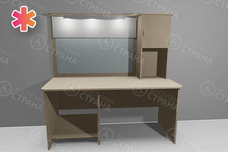 Наш стол оснащен зеркалом размером 643х943 мм, светильником мощностью 36 Вт и габаритами 600х64х40 мм, регулируемыми ножками в количестве 4-х штук, а также рулонной шторой 1000х1600 мм. Дополнительно установлен шкафчик и полочки для размещения дидактических материалов и инструментов для занятий.