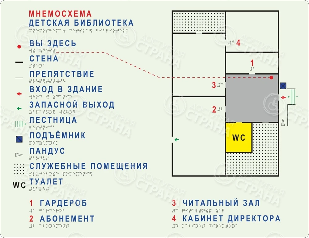 Комплексная тактильная план-схема объекта, сочетающая в себе плосковыпуклые элементы (очертания стен помещения/здания, путей движения и условных обозначений), а также надписи, выполненные шрифтом Брайля. Предназначена для информирования, безопасности и ориентации в пространстве человека с глубокими нарушениями зрения. Размещается с правой стороны по ходу движения на удалении от 3 до 5 м.