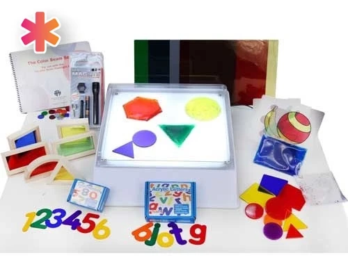 В «Светящийся набор» входит комплект уникальных материалов, которые могут использоваться в процессе обучения навыкам распознавания букв, цифр, форм и цветов. Освещенная белая поверхность «Лайтбокса» обеспечивает высококонтрастный фон и источник освещения для предметов, входящих в состав набора. Данное свойство набора обеспечивает возможность обучения основным визуальным навыкам детей с нарушенным зрением.