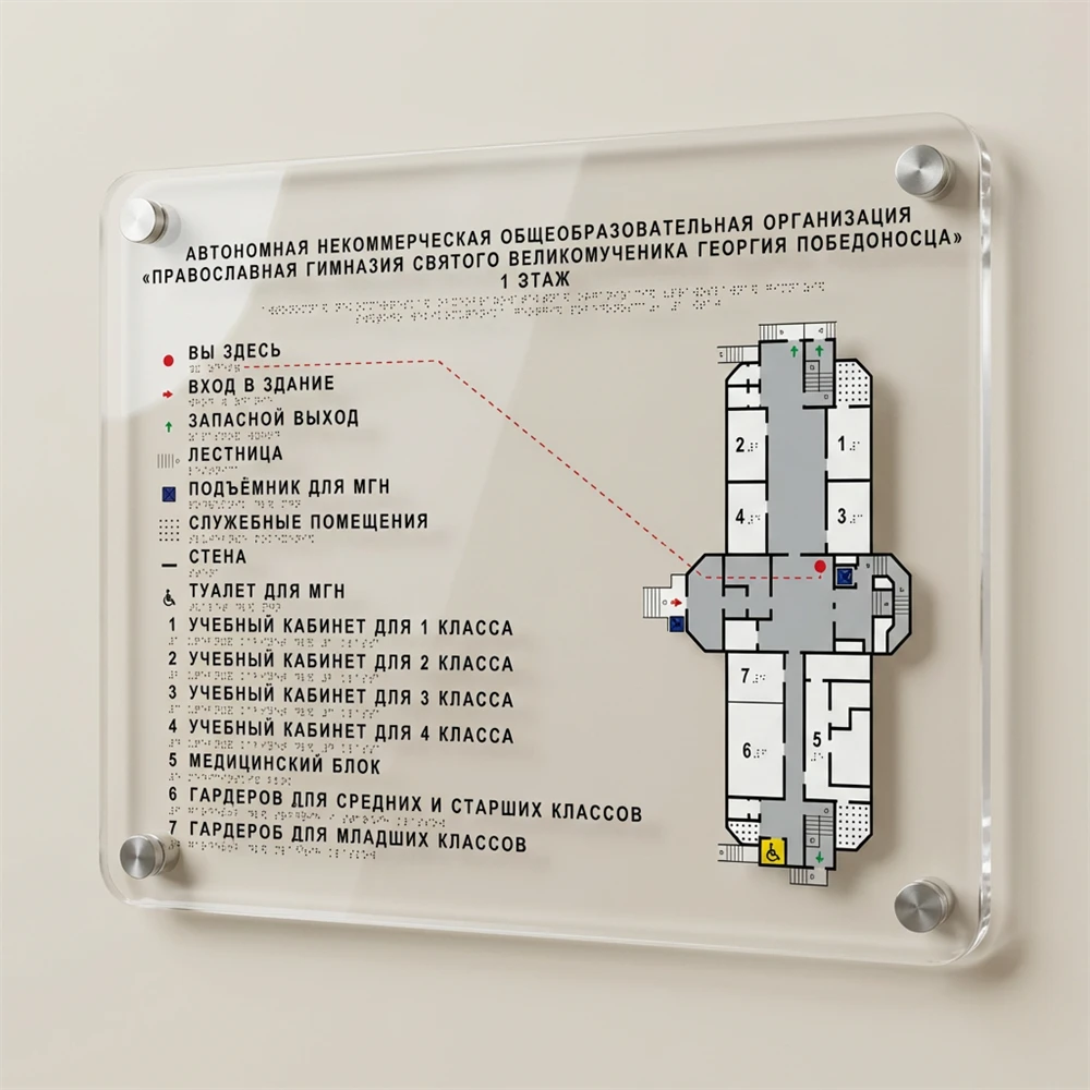 Мнемосхемы по системе Брайля являются важным элементом тактильной адаптации помещений для незрячих. Регламентируется нормативным документом СП 59.13330.2020. Выполнено по ГОСТ Р 56832-2015.