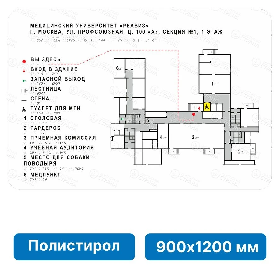 Для создания макета мнемосхемы нам понадобится план помещения (БТИ) или актуальные планы эвакуации, а также список условных обозначений, которые вы хотите разместить на мнемосхеме. После подготовки макета, с включением всех надписей и их дублирования шрифтом Брайля, мы отправим вам макет мнемосхемы для утверждения. Мнемосхема будет напечатана только после получения письменного согласования с вами.