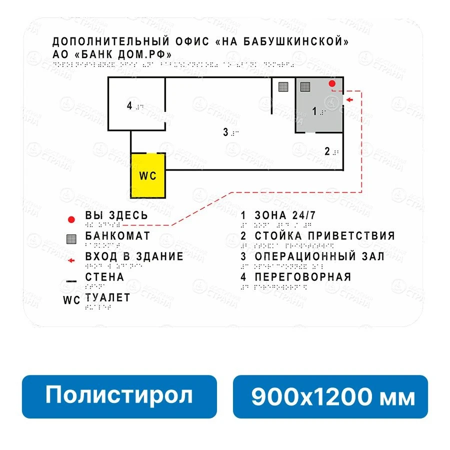 Для создания макета мнемосхемы нам понадобится план помещения (БТИ) или актуальные планы эвакуации, а также список условных обозначений, которые вы хотите разместить на мнемосхеме. После подготовки макета, с включением всех надписей и их дублирования шрифтом Брайля, мы отправим вам макет мнемосхемы для утверждения. Мнемосхема будет напечатана только после получения письменного согласования с вами.
