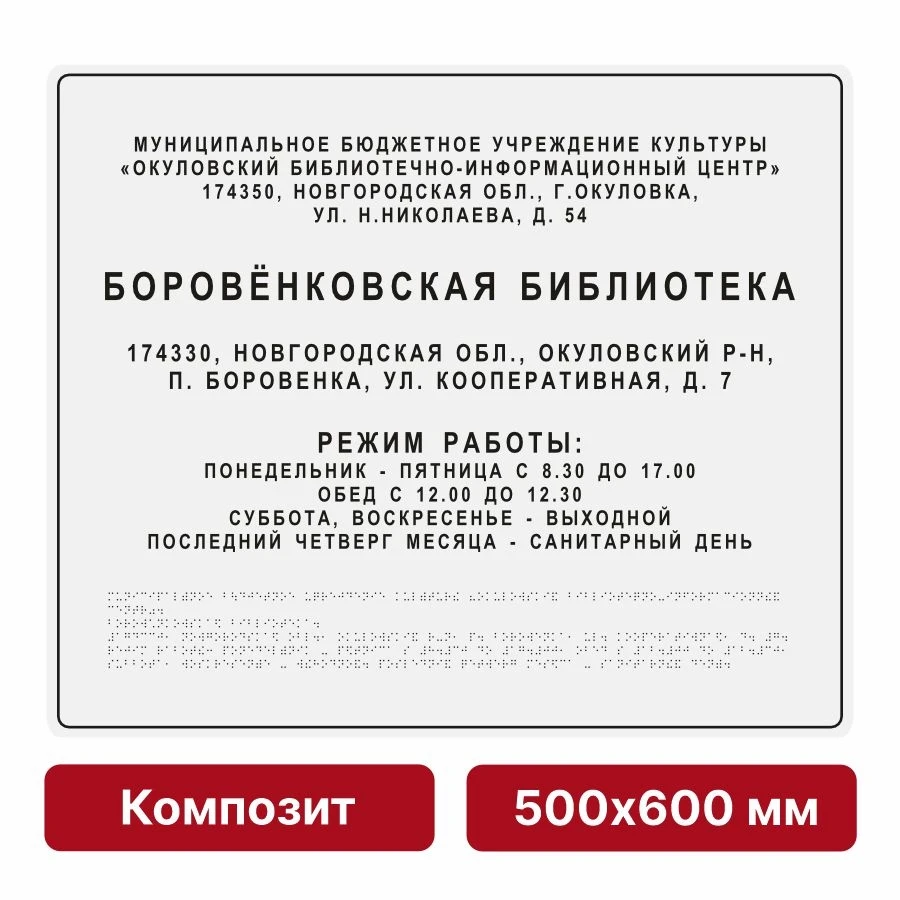 Самый популярный формат. Рекомендуем для поликлиник, библиотек, МФЦ и административных зданий. На нем свободно помещаются: название, адрес, режим работы и шрифт Брайля. - 500х600 мм