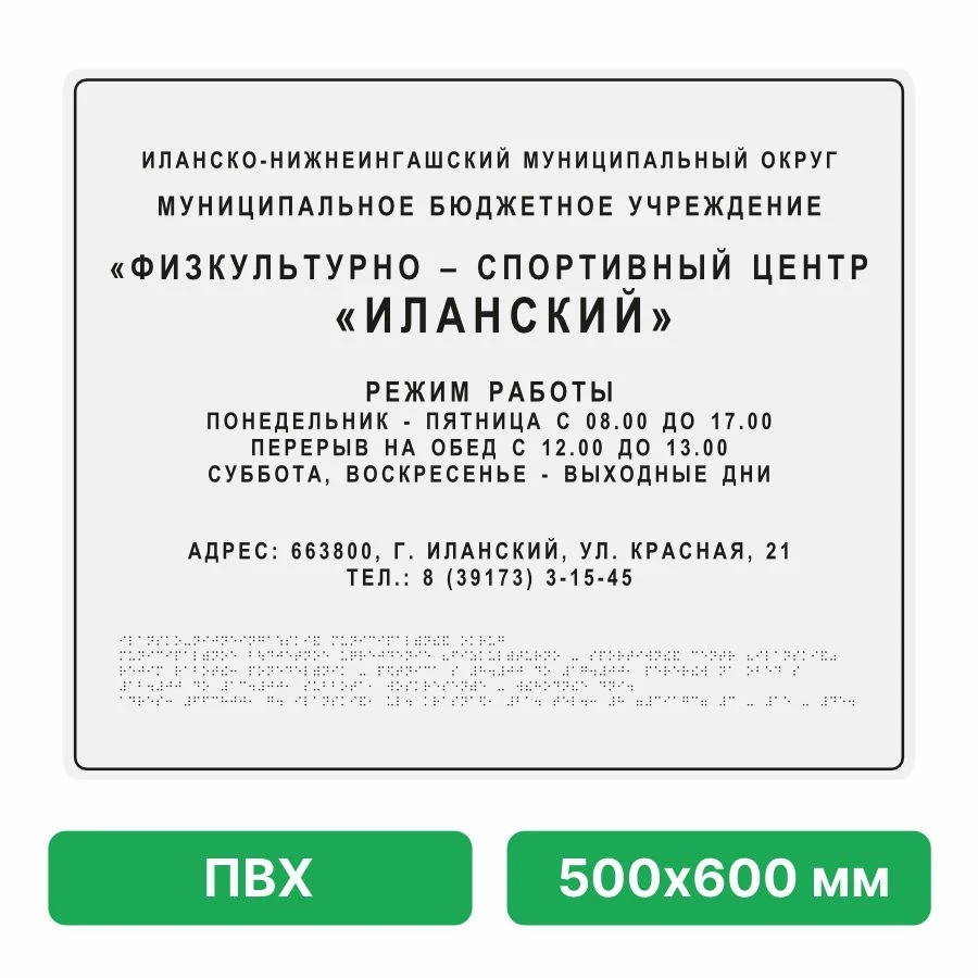 Самый популярный формат. Рекомендуем для поликлиник, библиотек, МФЦ и административных зданий. На нем свободно помещаются: название, адрес, режим работы и шрифт Брайля. - 500х600 мм