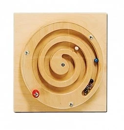 Лабиринт в виде колеса. Представляет собой фрезерованный деревянный диск в форме спирали, в котором расположены разноцветные шарики. Шарики скрыты под прозрачным акриловым стеклом. При вращении шарики двигаются внутри лабиринта. Игра позволит ребенку тренировать внимание, память, мелкую моторику.