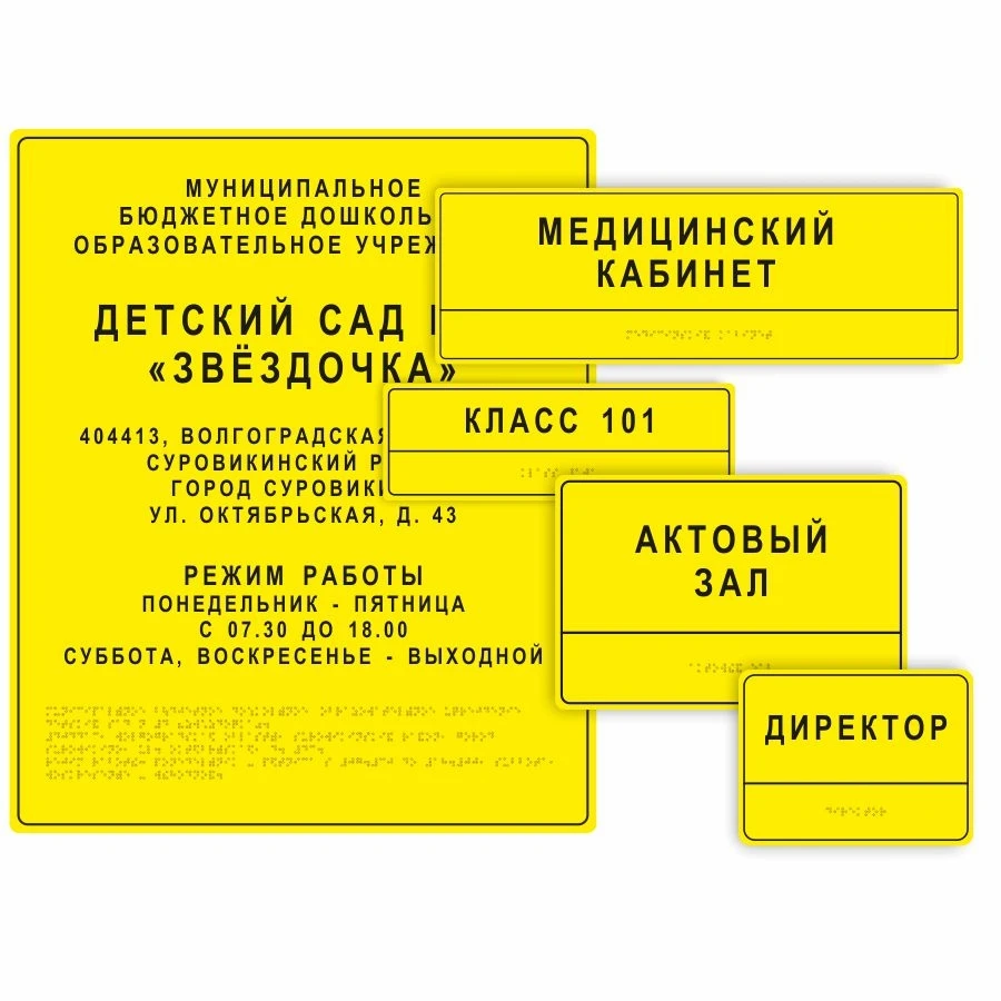 - Тактильные таблички из ударопрочного пластика с дублированием информации шрифтом Брайля