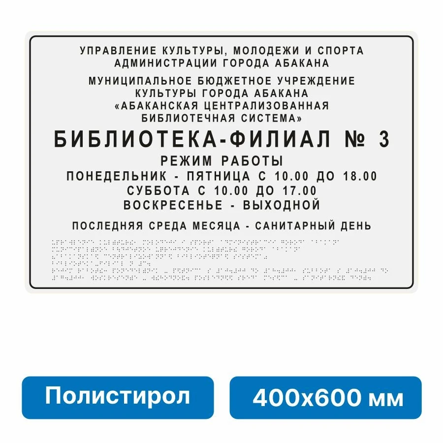 Самый популярный формат. Рекомендуем для поликлиник, библиотек, МФЦ и административных зданий. На нем свободно помещаются: название, адрес, режим работы и шрифт Брайля. - 500х600 мм