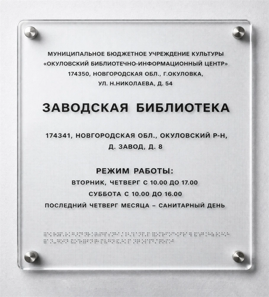 Самый популярный формат. Рекомендуем для поликлиник, библиотек, МФЦ и административных зданий. На нем свободно помещаются: название, адрес, режим работы и шрифт Брайля. - 500х600 мм