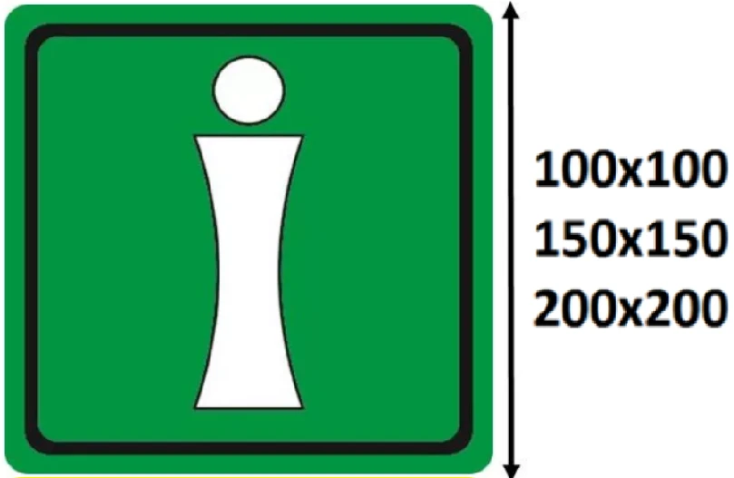 Специализированные знаки, предназначенные для установки для инвалидов, должны иметь следующие размеры стороны квадрата: перед входами в общественные здания и сооружения, а также в автобусы, троллейбусы и трамваи — от 150 до 250 мм; внутри общественных зданий и сооружений — от 150 до 200 мм; внутри железнодорожных вагонов, судов воздушного и водного транспорта, от 100 до 150 мм.