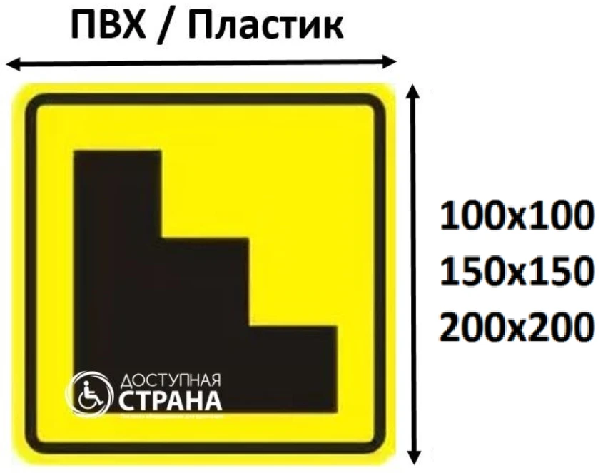 Специализированные знаки, предназначенные для установки для инвалидов, должны иметь следующие размеры стороны квадрата: перед входами в общественные здания и сооружения, а также в автобусы, троллейбусы и трамваи — от 150 до 250 мм; внутри общественных зданий и сооружений — от 150 до 200 мм; внутри железнодорожных вагонов, судов воздушного и водного транспорта, от 100 до 150 мм.