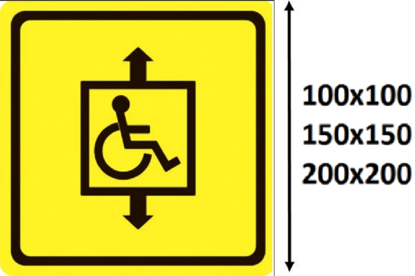 Специализированные знаки, предназначенные для установки для инвалидов, должны иметь следующие размеры стороны квадрата: перед входами в общественные здания и сооружения, а также в автобусы, троллейбусы и трамваи — от 150 до 250 мм; внутри общественных зданий и сооружений — от 150 до 200 мм; внутри железнодорожных вагонов, судов воздушного и водного транспорта, от 100 до 150 мм.