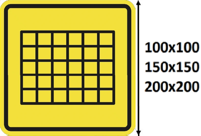 Специализированные знаки, предназначенные для установки для инвалидов, должны иметь следующие размеры стороны квадрата: перед входами в общественные здания и сооружения, а также в автобусы, троллейбусы и трамваи — от 150 до 250 мм; внутри общественных зданий и сооружений — от 150 до 200 мм; внутри железнодорожных вагонов, судов воздушного и водного транспорта, от 100 до 150 мм.