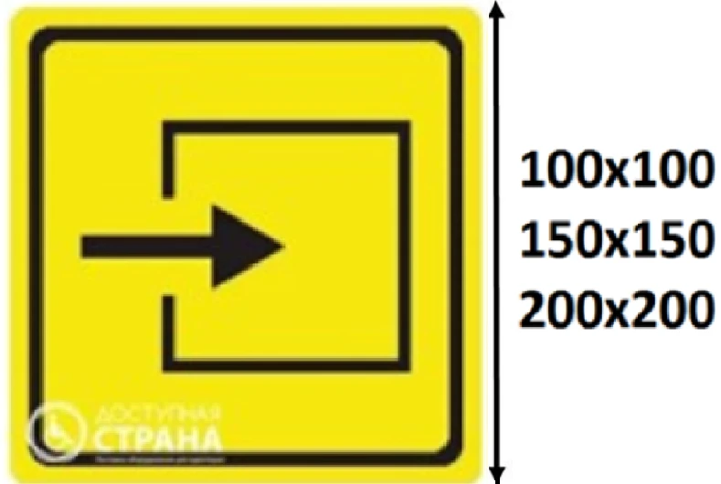 Специализированные знаки, предназначенные для установки для инвалидов, должны иметь следующие размеры стороны квадрата: перед входами в общественные здания и сооружения, а также в автобусы, троллейбусы и трамваи — от 150 до 250 мм; внутри общественных зданий и сооружений — от 150 до 200 мм; внутри железнодорожных вагонов, судов воздушного и водного транспорта, от 100 до 150 мм.