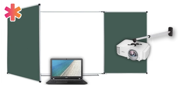 Интерактивная трёхэлементная доска. Доска имеет 5 рабочих поверхностей: Интерактивная мультитач доска на 10 активных касаний и 2 двухсторонних элемента зеленого цвета для письма мелом.