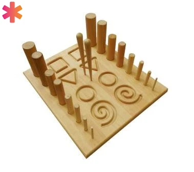Панель из натурального дерева с вырезанными парными фигурами (квадрат, круг, треугольник и т.д.) и параллельно попарно расположенными отверстиями. Комплектуется двумя стилусами и парными колышками круглого сечения различной высоты и диаметра (по 2 колышка каждого типоразмера).