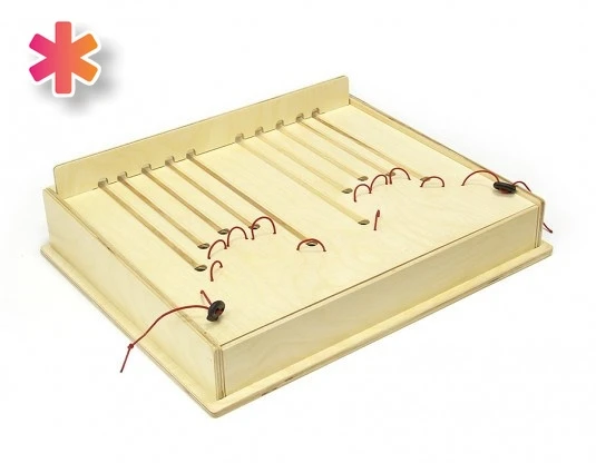 Взрослый раскладывает шарики на панели, в каждом желобке по шарику. В процессе игры постоянно добавляет шарики.