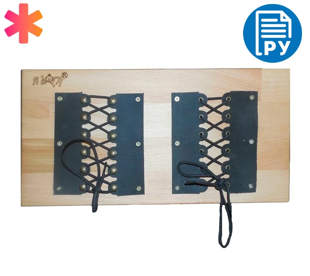 Тренажер Шнуровка применяется для развития и восстановления мелкой моторики, восстановления бытовых навыков, развития ловкости и подвижности пальцев рук. Представляет собой панель с расположенными на ней двумя кожаными пластинами с отверстиями и крючками со шнурками для упражнений зашнуровывания-расшнуровывания.