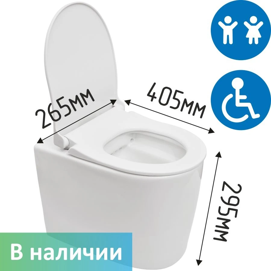 Детский подвесной унитаз с сиденьем с микролифтом, размер 405х265х295мм, выполнен в соответствии с действующими стандартами. Модель унитаза соответствует ГОСТ 30493-2017 «Изделия санитарные керамические. Классификация и основные размеры (с Поправкой). Высота чаши данного детского подвесного унитаза - всего 295мм, высота сиденья - 10мм, данные габариты позволяют разместить унитаз на требуемой в стандарте высоте 335мм с сохранением технического зазора над полом. В этом главная особенность и уникальность данной модели.
