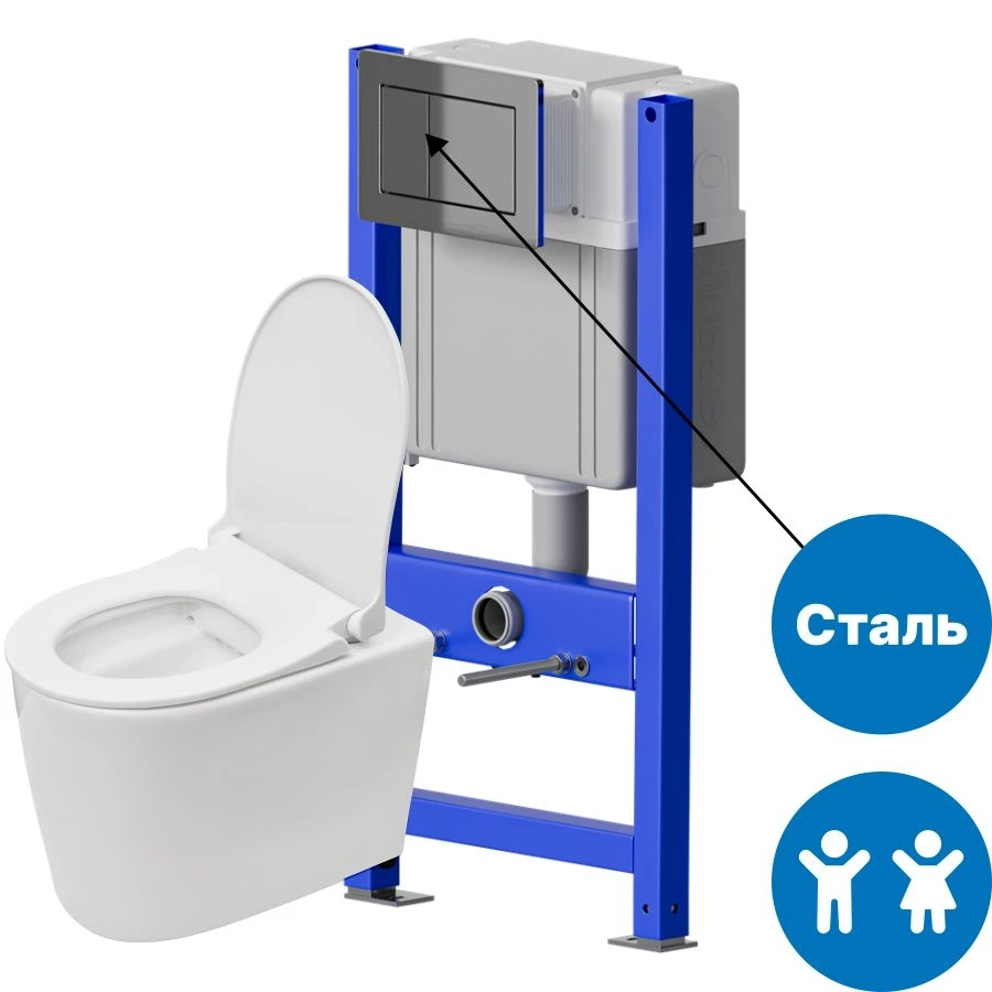 Унитаз детский подвесной SANTEYA UNITY KIDS с инсталляцией SANTEYA FRAME KIDS и кнопкой смыва из нержавеющей стали SANTEYA STEEL