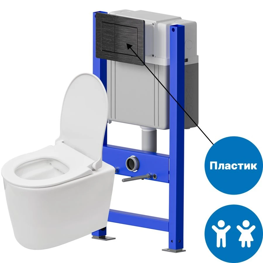 Унитаз детский подвесной SANTEYA UNITY KIDS с инсталляцией SANTEYA FRAME KIDS и кнопкой смыва из пластика под сталь SANTEYA BASE