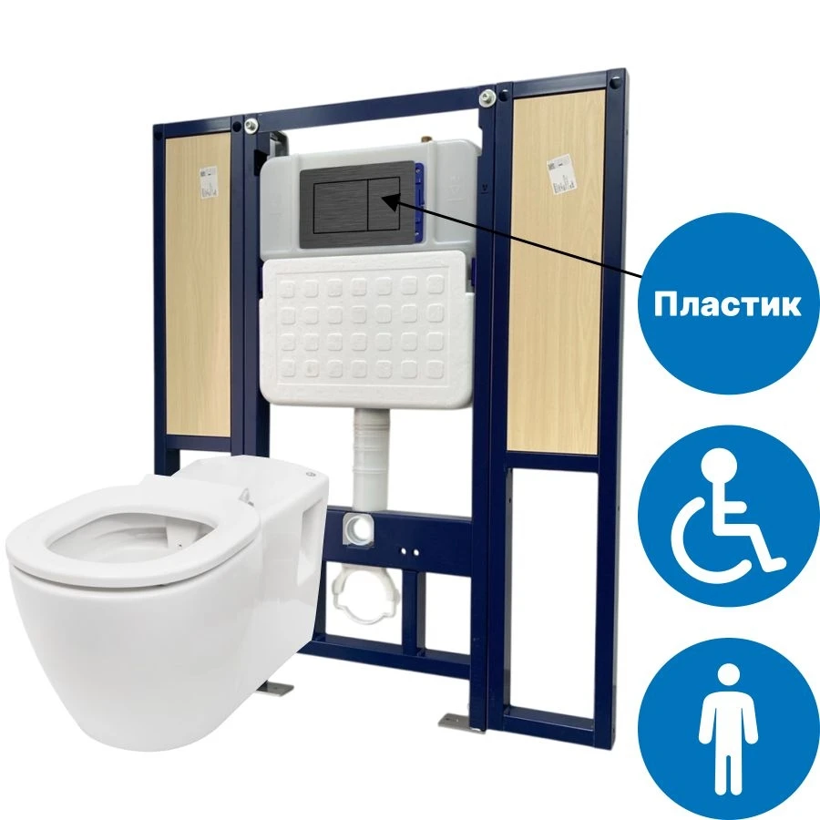 Унитаз для инвалидов подвесной DSTRANA с инсталляцией с закладными и кнопкой смыва из пластика под сталь SANTEYA BASE