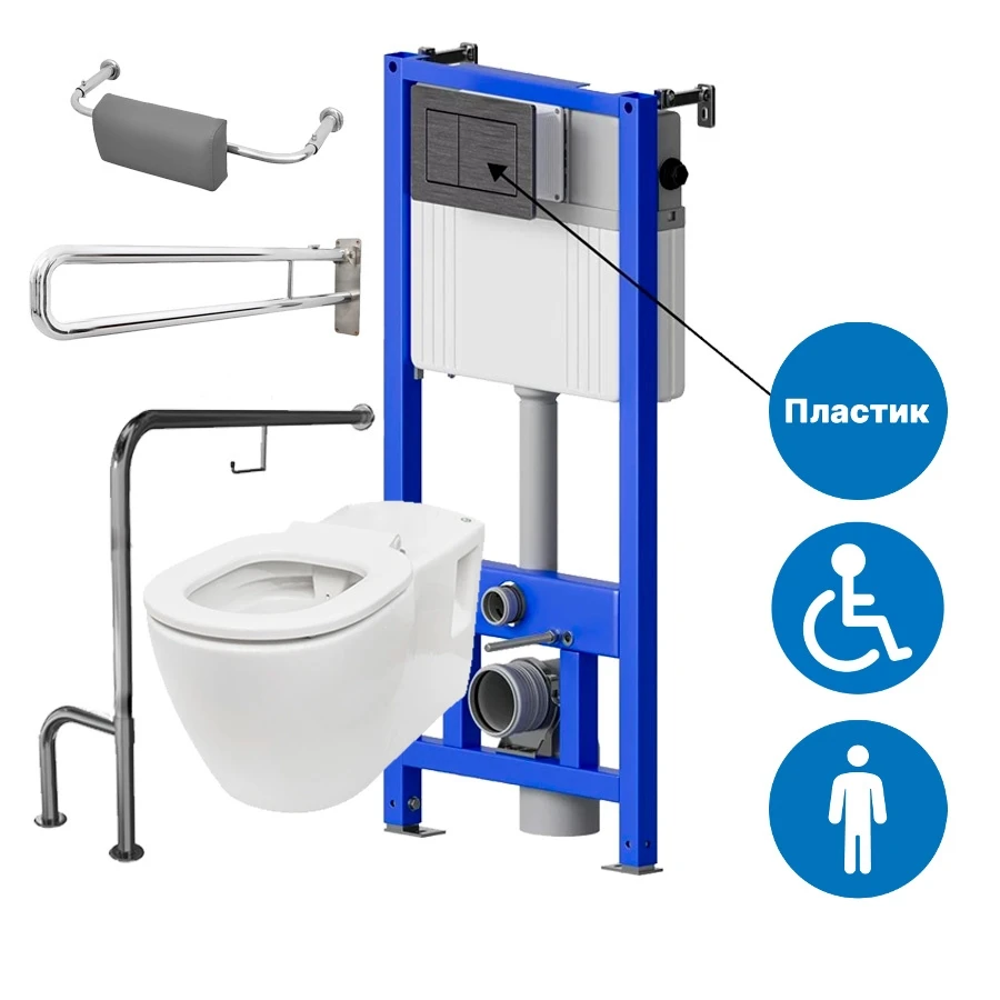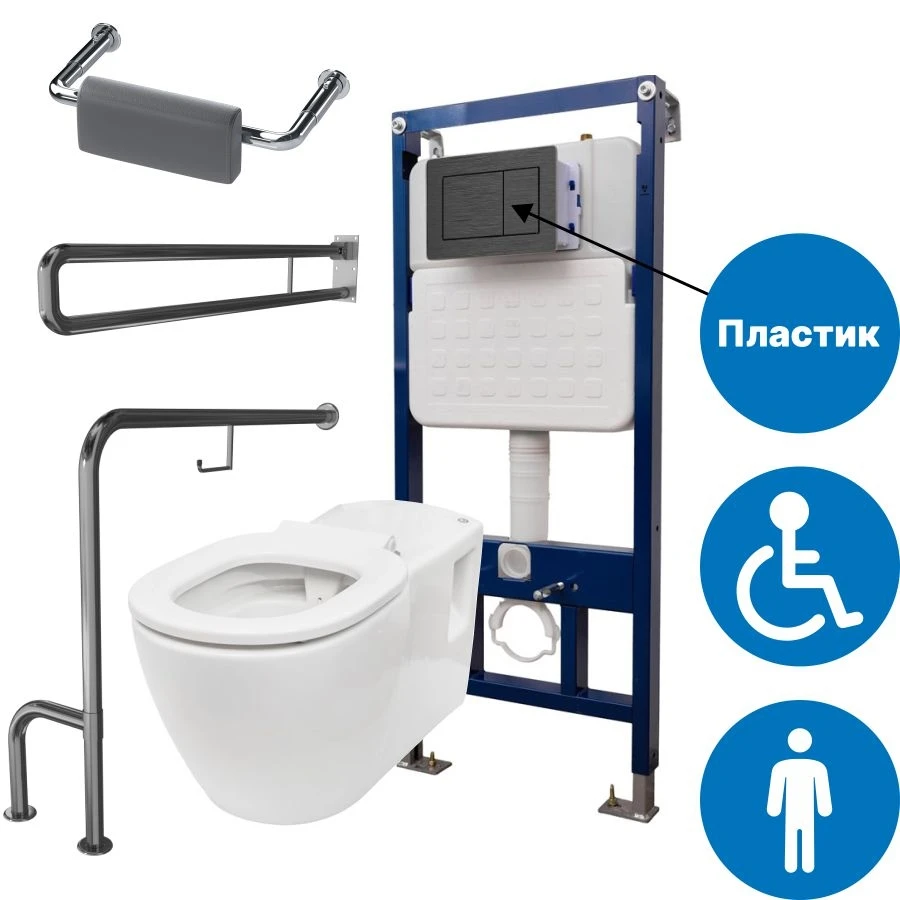 Унитаз для инвалидов подвесной DSTRANA AID с инсталляцией, кнопкой смыва из пластика под сталь SANTEYA BASE, поручнями и опорой под спину по ГОСТ