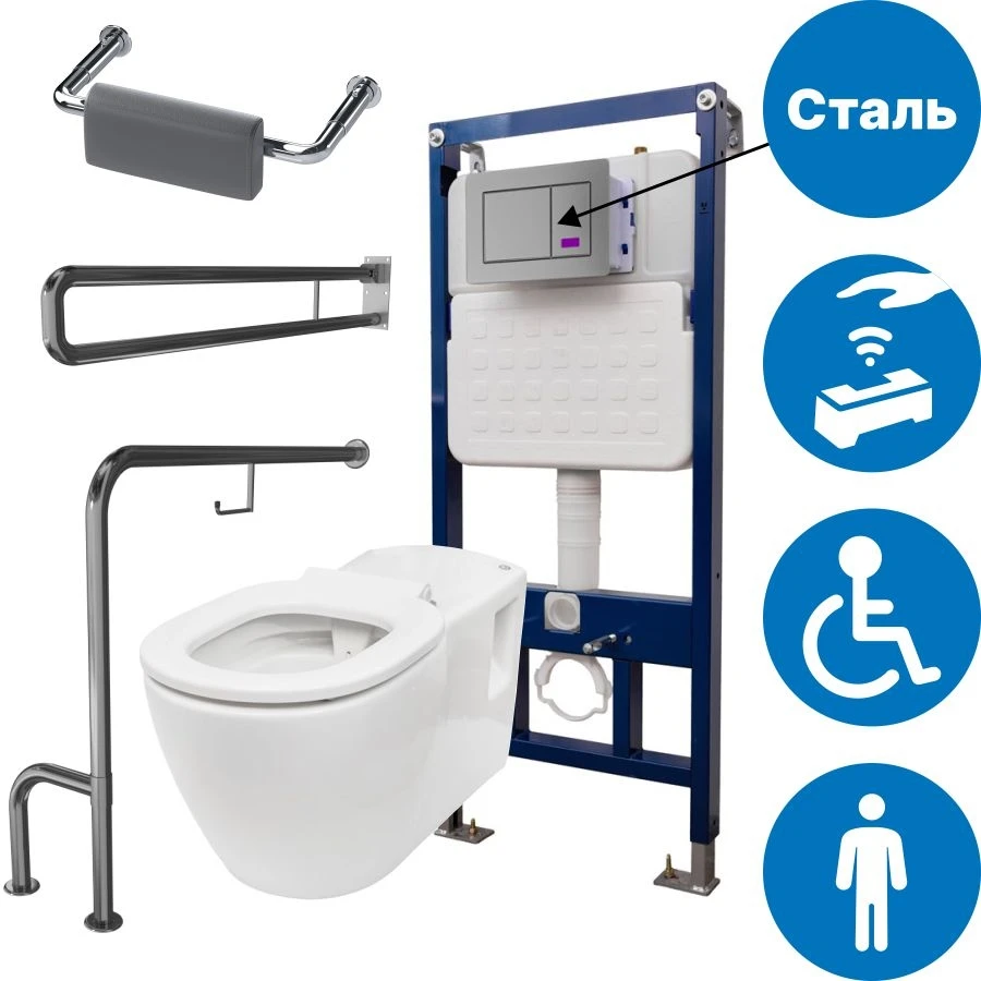 Унитаз для инвалидов подвесной DSTRANA AID с инсталляцией, сенсорной кнопкой смыва из нержавеющей стали SANTEYA SENSOR, поручнями и опорой под спину по ГОСТ