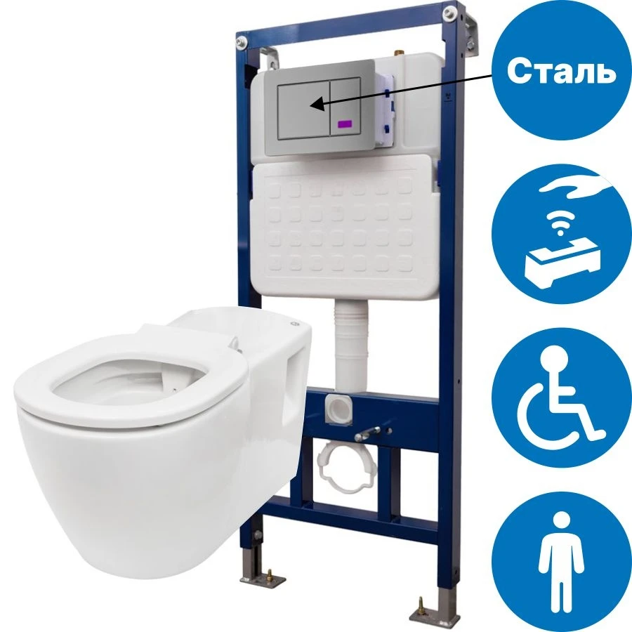 Унитаз для инвалидов подвесной DSTRANA с инсталляцией и сенсорной кнопкой смыва из нержавеющей стали SANTEYA SENSOR