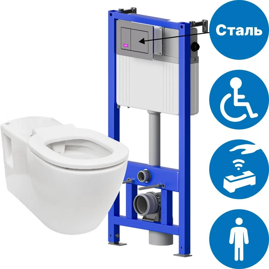 Унитаз для инвалидов подвесной DSTRANA с инсталляцией SANTEYA FRAME с сенсорной кнопкой смыва из нержавеющей стали SANTEYA SENSOR
