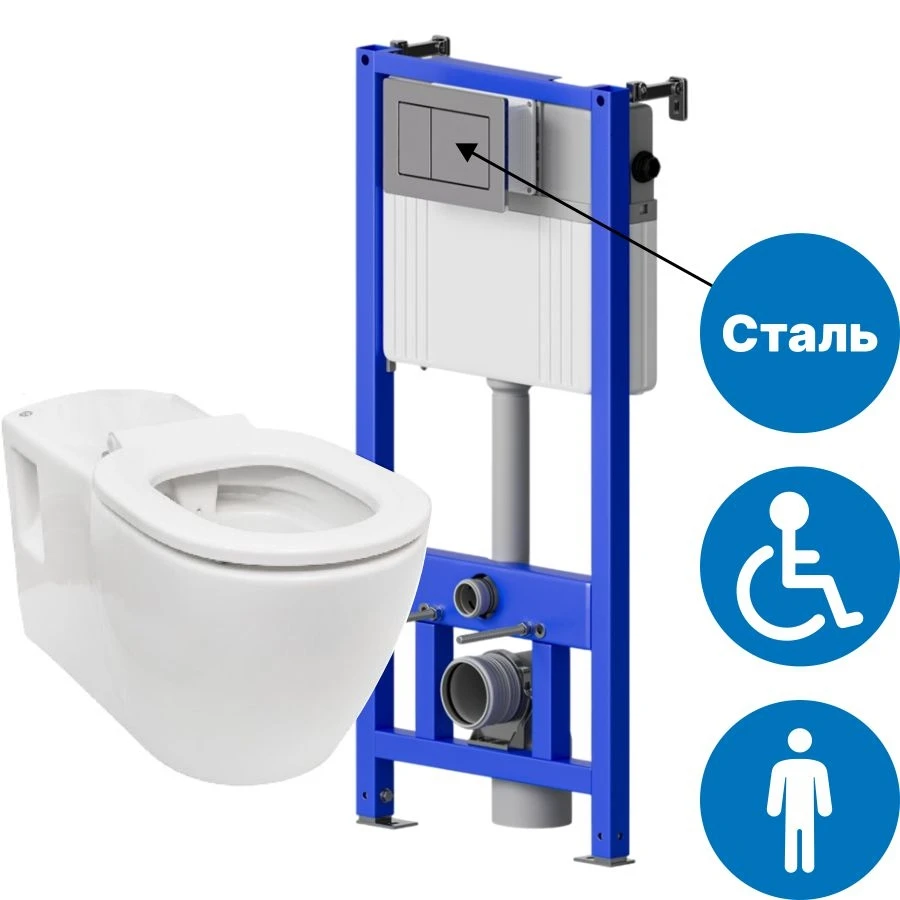 Унитаз для инвалидов подвесной DSTRANA с инсталляцией SANTEYA FRAME и кнопкой из нержавеющей стали SANTEYA STEEL