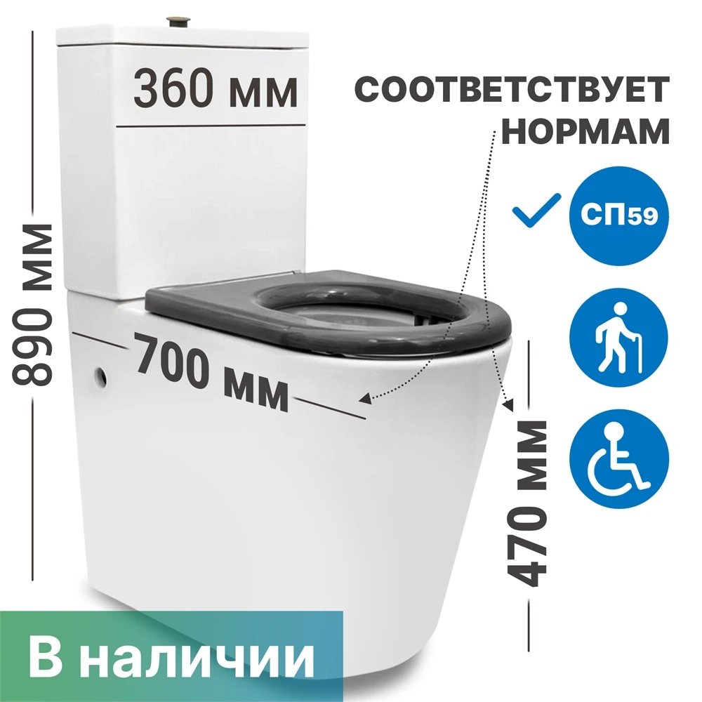 - 100% соответствие нормативам - единственный в России унитаз полностью соответствующий нормам СП 59.13330.2020 (размеры: длина чаши 700мм, а высота 450мм)