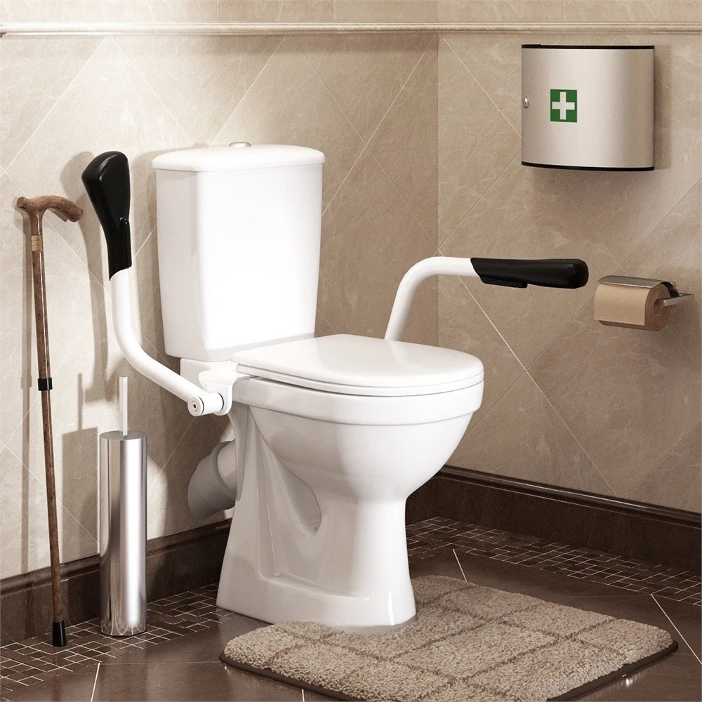 Унитаз для инвалидов с высокой чашей в комплекте с откидными подлокотниками, с бачком, сиденьем и крышкой.