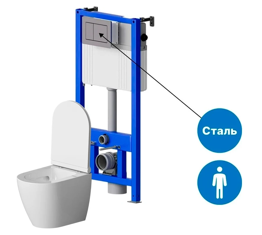 Унитаз подвесной SANTEYA UNITY с инсталляцией SANTEYA FRAME и кнопкой смыва из нержавеющей стали SANTEYA STEEL