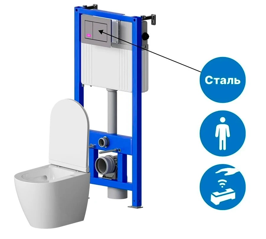 Унитаз подвесной SANTEYA UNITY с инсталляцией SANTEYA FRAME и сенсорной кнопкой смыва из нержавеющей стали SANTEYA SENSOR