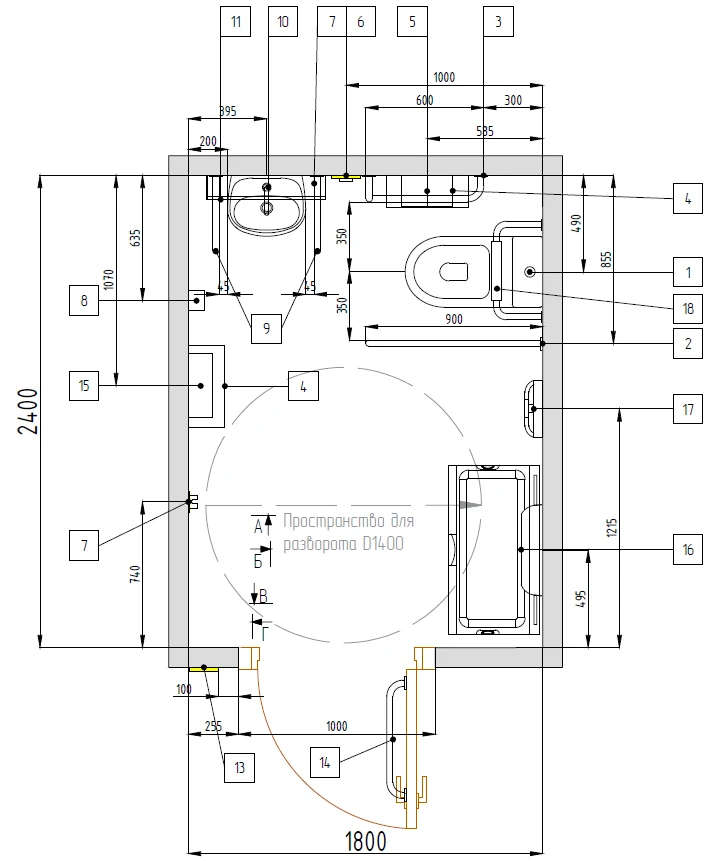 В соответствии с действующими нормами СП 59.13330.2020 санузел должен быть адаптирован для инвалидов специализированным оборудованием (все необходимое учтено в наборе!).